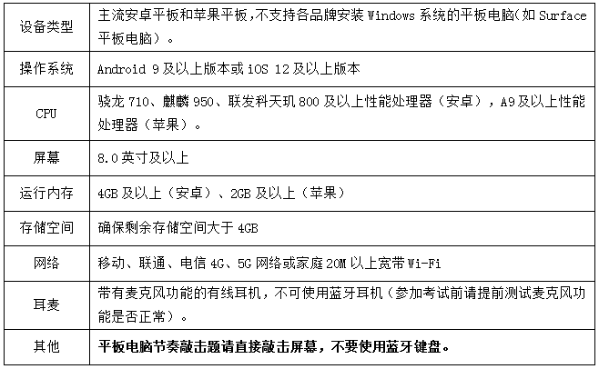1.设备要求:考试支持计算机、Pad和手机3种设备类型,考生根据自身情况自备考试设备(至少1种),设备具体要求如下